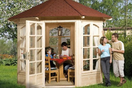 Набирают популярность беседки с большими ваннами или мини-бассейнами, их еще называют SPA-беседками. К такой конструкции непременно придется подвести воду и слив. Саму беседку можно сделать как открытой, так и закрытой. В случае если беседка открытая, ванну встраивают что-то похожее на подиум и предусматривают возможность полностью закрыть эту конструкцию (например, своеобразным люком, брезентом), чтобы купель не пострадала в период холодов. Более удачным решением станет остекление такой беседки. Летом окна можно открыть, а зимой – наоборот.