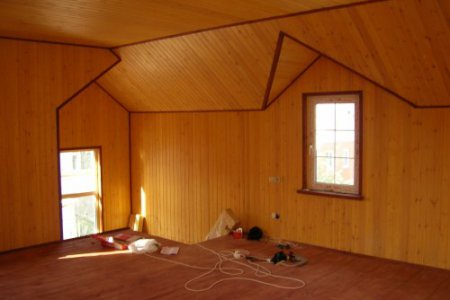 На этапе отделки мансардного помещения для облицовки стен часто используют листы гипсокартона. Также пользуются спросом деревянные панели, вагонка или фанера. Гипсокартон также используется для возведения перегородок. Для этого он крепится на металлические стойки. Между стропилами прокладывается утеплитель, чтобы в помещении было тепло зимой. Стены можно покрасить или оклеить обоями.